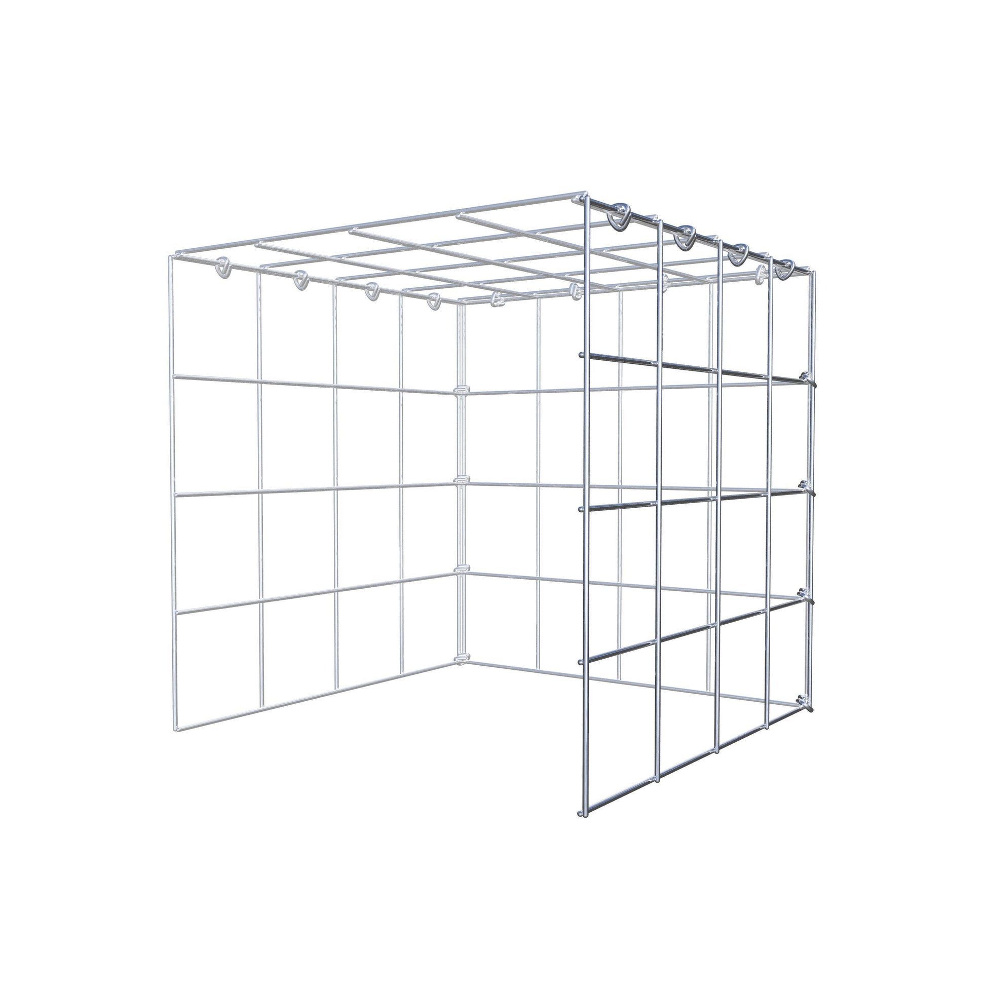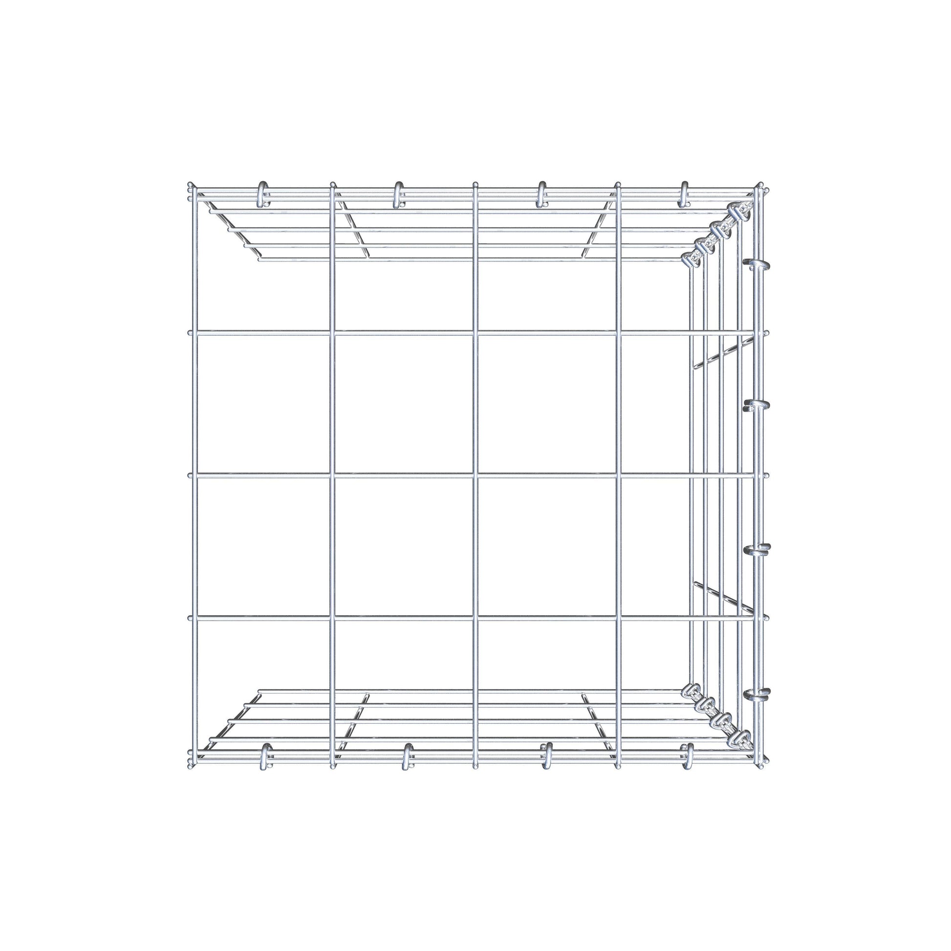 • Hinweis: kein eigenes Bodengitter und kein eigenes Stirngitter – die Verbindung erfolgt über das Deckelgitter und den Verschluss der unteren Gabione sowie den Verschluss der seitlichen Gabione.