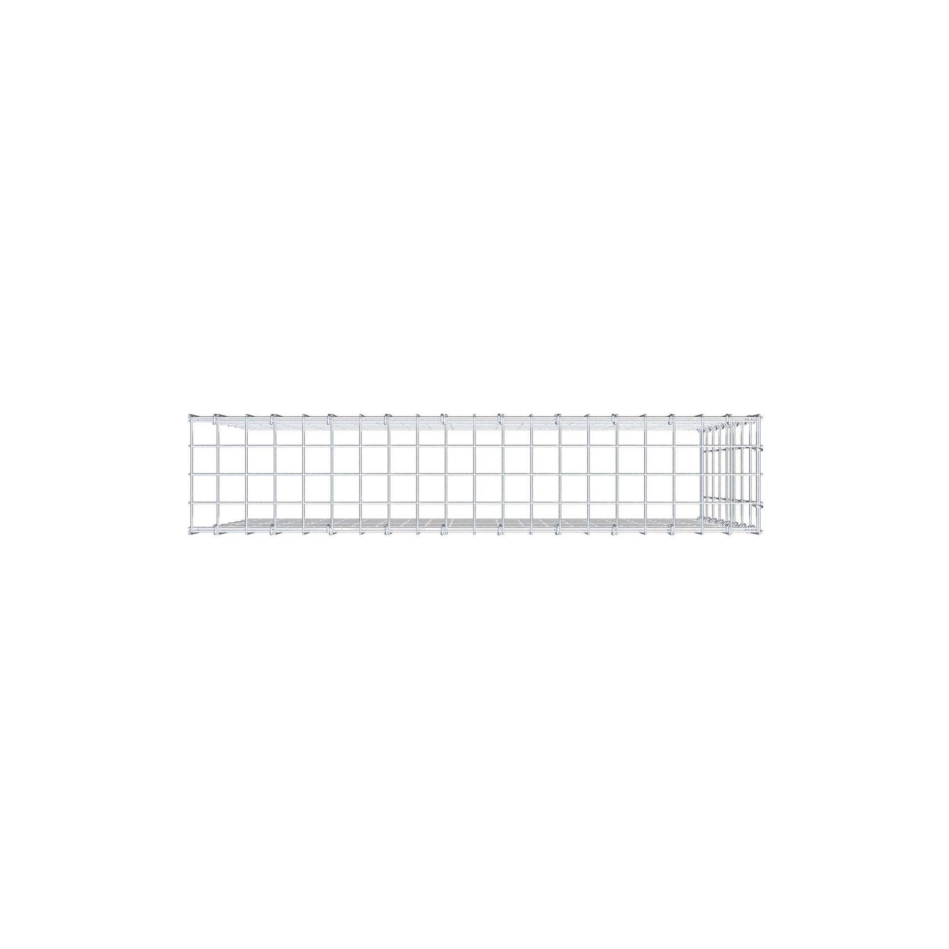 - Remarque : pas de propre grille de fond ni de grille frontale - la liaison se fait par la grille du couvercle et la fermeture du gabion inférieur ainsi que par la fermeture du gabion latéral.
