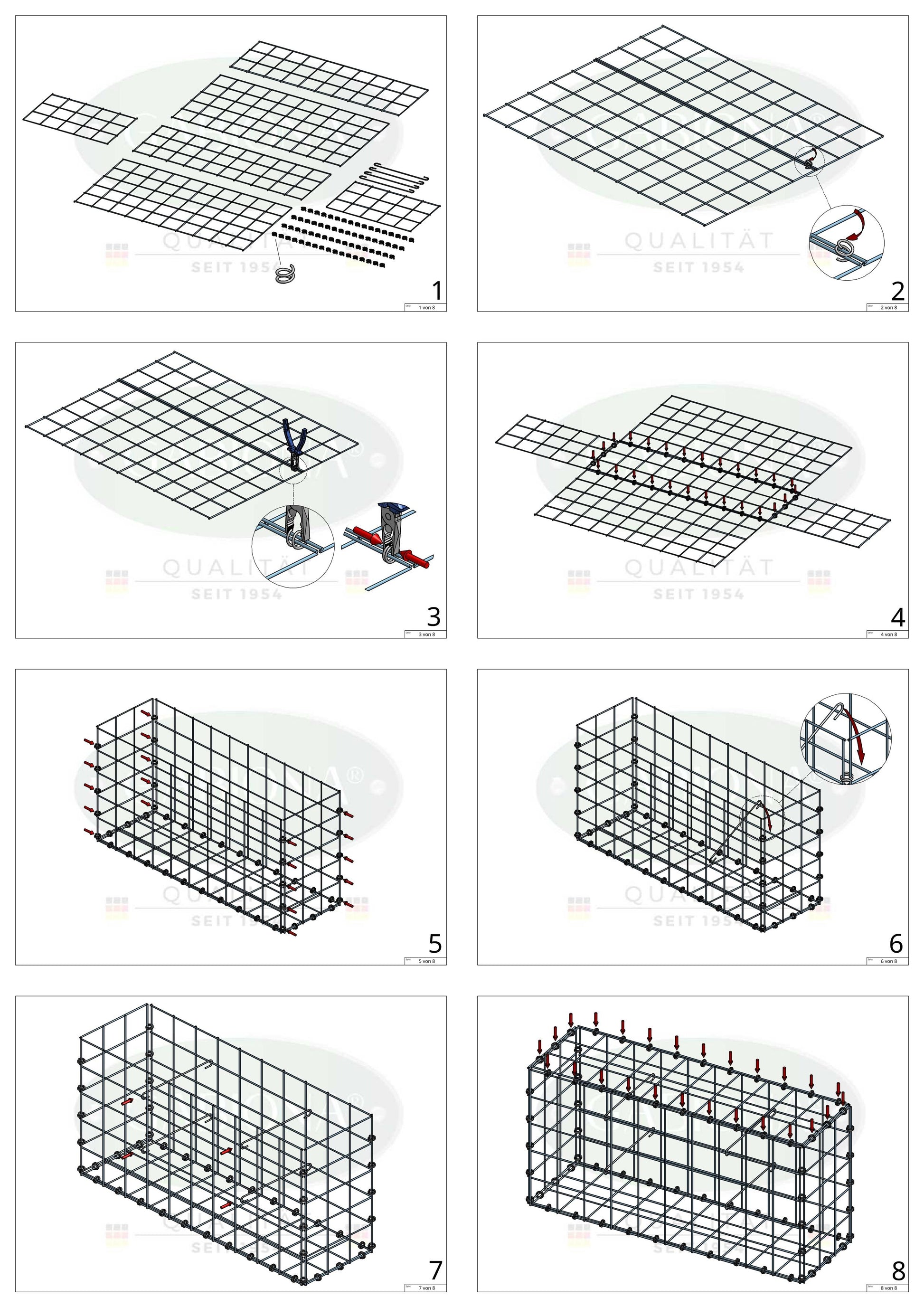 Ce gabion robuste a été spécialement conçu pour répondre aux exigences les plus élevées en matière de stabilité, de longévité et de résistance aux intempéries. La construction est fermée de manière sûre par plusieurs anneaux en spirale qui sont torsadés par deux fils et fixés à l'aide d'une pince. Cela permet un montage facile et une connexion particulièrement stable des grilles.